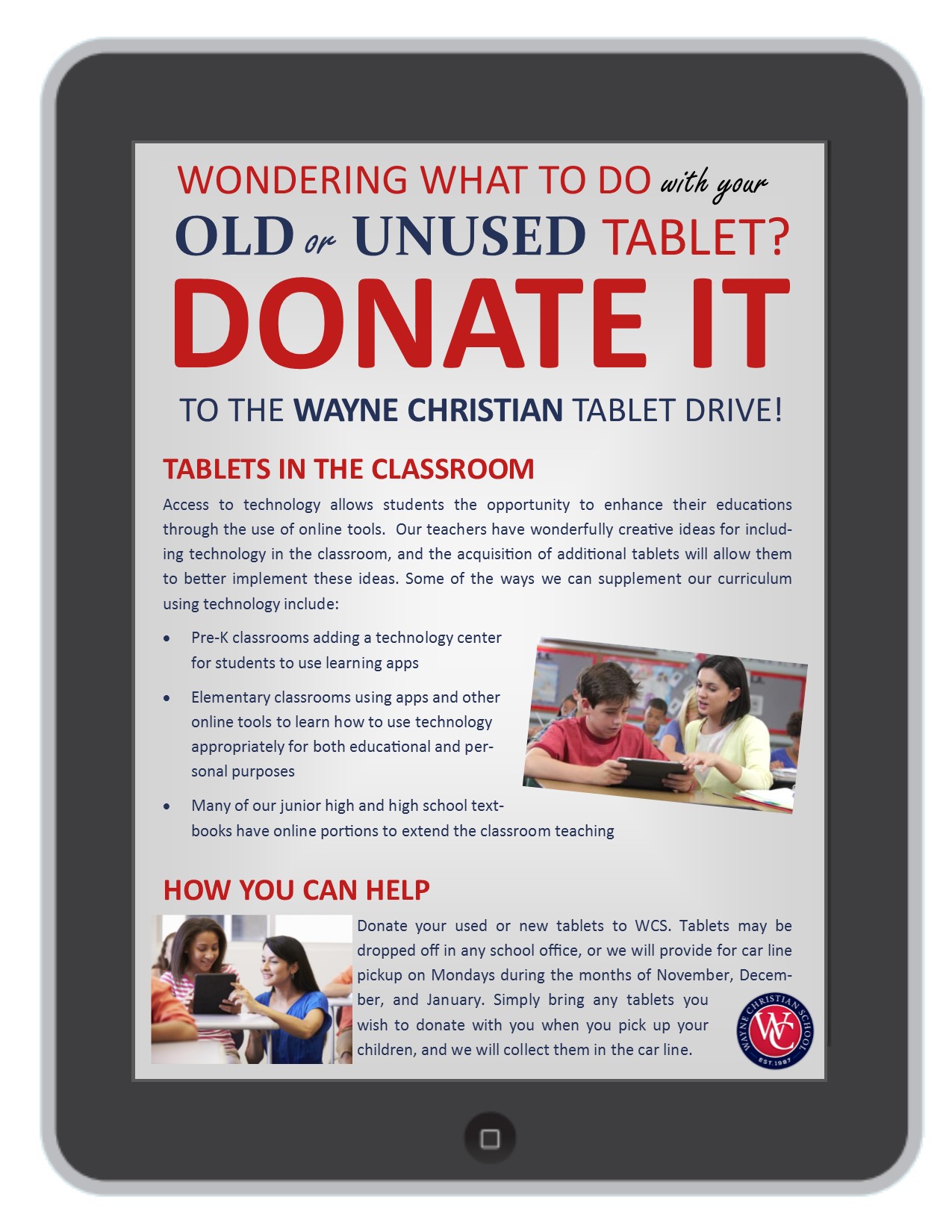 Tablet Drive Posted byWCSTalonTimesNovember 26, 2018November 20, 2018Posted inUncategorized, What's Happening Share this: Click to share on Facebook (Opens in new window) Facebook Click to share on Pinterest (Opens in new window) Pinterest Click to share on X (Opens in new window) X Click to print (Opens in new window) Print Click to email a link to a friend (Opens in new window) Email Like Loading... Related