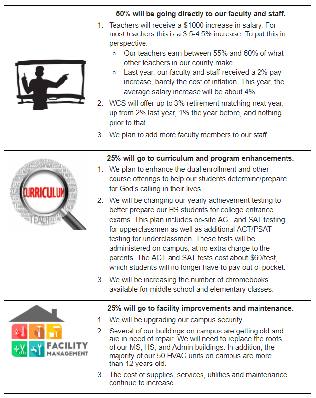 We take seriously our mission to partner with parents and churches in the education of children, and so we wanted to share some of the factors of the tuition increase for the upcoming school year. Ideally, we would have held a parent meeting to explain the tuition increase. However, we want you to know that we do not take any type of tuition increase lightly.