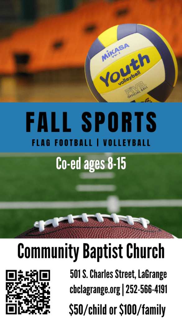 Community Baptist Church, one of our supporting churches, has co-ed youth sports leagues for volleyball and flag football.