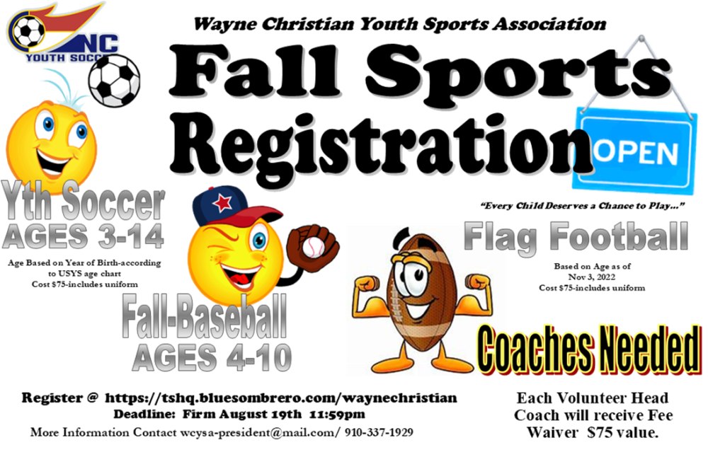 The WCS Youth Sports Association is taking registration for fall soccer, flag football, and baseball.
